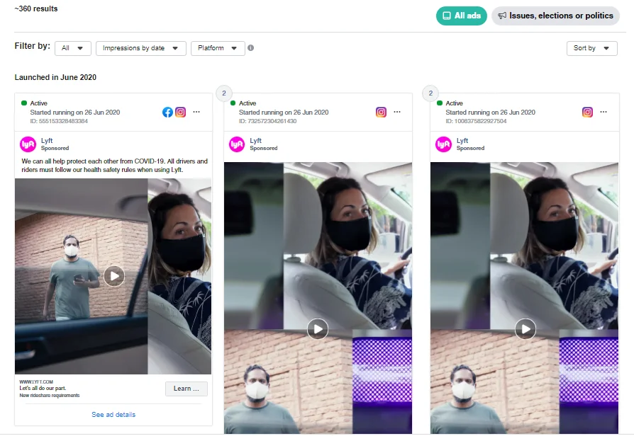 You can explore their ad library and take a look at their currently running advertisements. if it’s a global company you can filter by countries, activity status, and impression by date.