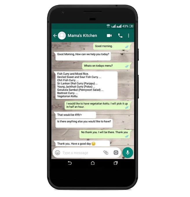 Ordering Food- Everyone has ordered fast food via the phone. Whatsapp could do the job more faster, entertaining many orders as possible at the same time. Automated messages of the daily menu could be updated daily (this could be pre-programmed).